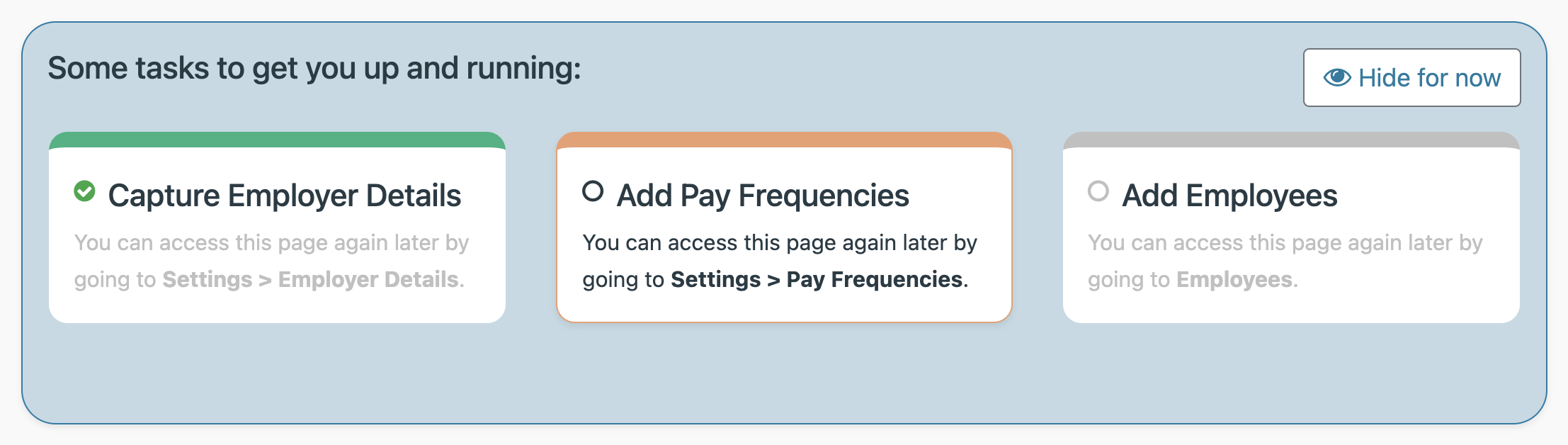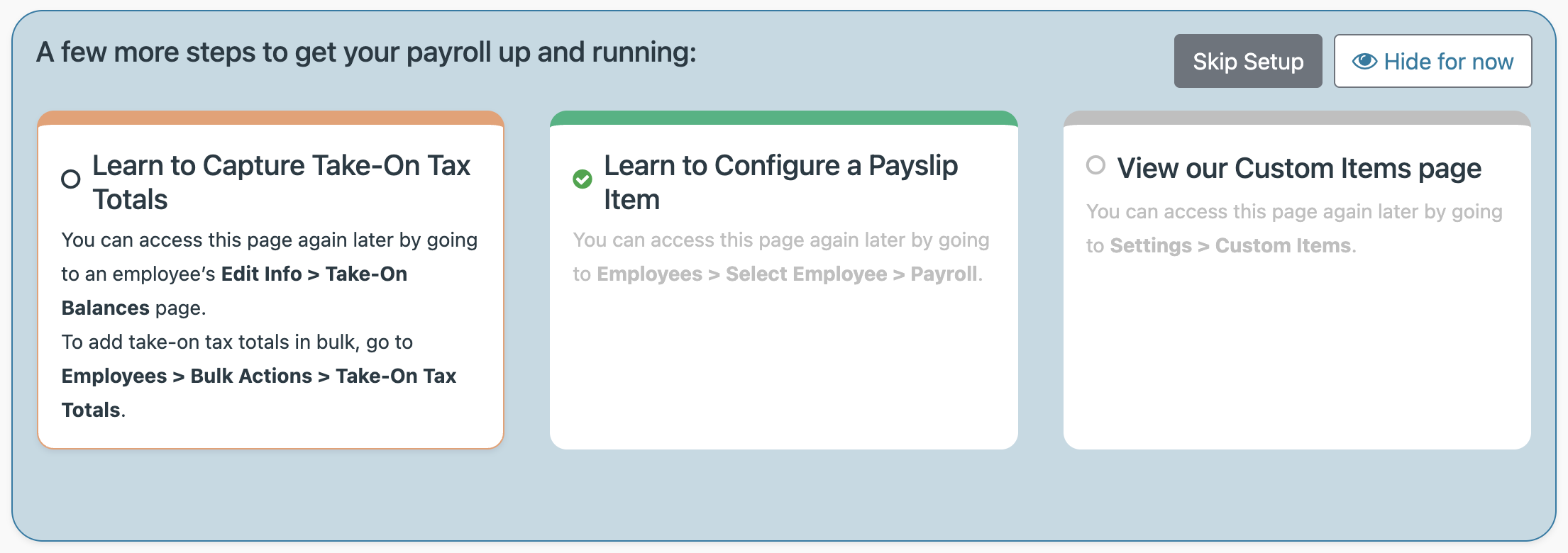 You will be guided through your payroll setup via the Payroll Setup card. You can hide and access this card in the same way as the Company Setup card.