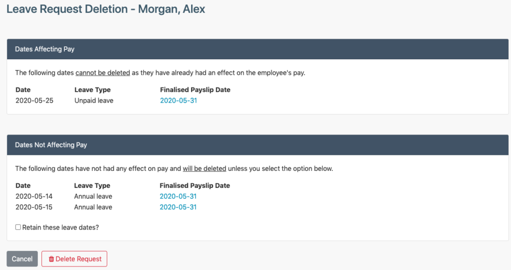 The Dates Affecting Pay section indicates which of the leave days that form part of the request cannot be deleted, as they are part of a finalised payslip, and the leave impacts the Nett Pay on that payslip.